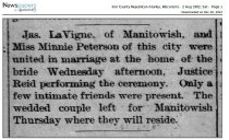 Early pioneer Joe LaVigne- marriage to Minnie Peterson, business cards and obituary. 1902-1940 - Joe LaVigne, guide, logger, farmer and caretaker (for A. Himes, Chicago) also rented cabins.